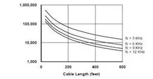 變頻器的載波頻率越高,輸出電流波形越接近正弦波,這會降低電機的運行溫度,從而延長絕緣的壽命。但是,更高的載波頻率意味著每秒鐘產生的尖峰電壓數量更多,對電機的沖擊的次數更多。圖4給出了絕緣壽命隨著電纜長度與載波頻率的變化。從圖中可知,對于200英尺長的電纜,當載波頻率從3kHz提高到12kHz(變化4倍)時,絕緣的壽命從大約8萬小時降低到2萬小時(相差4倍)。